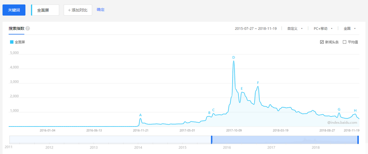 百度指数显示,关键词“全面屏”搜索指数最大值出现在2017年9月份,正值iPhone X发布。自那之后,刘海屏也变成全面屏手机最常见造型。