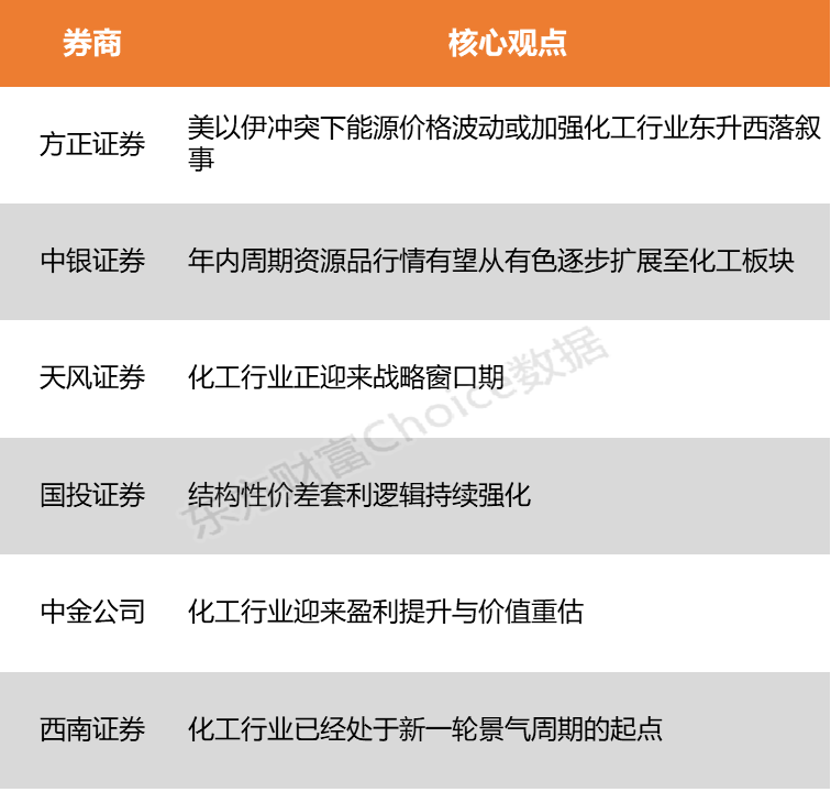 方正证券表示,本轮中东冲突下欧洲能源成本暴涨,未来或加速化工产能出清,东升西落叙事将持续强化。中银证券指出,大宗商品周期轮动的必然趋势、原油价格的上行支撑、行业供需格局的持续改善,共同构成了A股化工行业上行的核心逻辑。