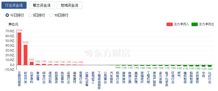行业资金方面,截至收盘,互联网服务、软件开发、化学原料等净流入排名靠前,其中互联网服务净流入67.59亿。