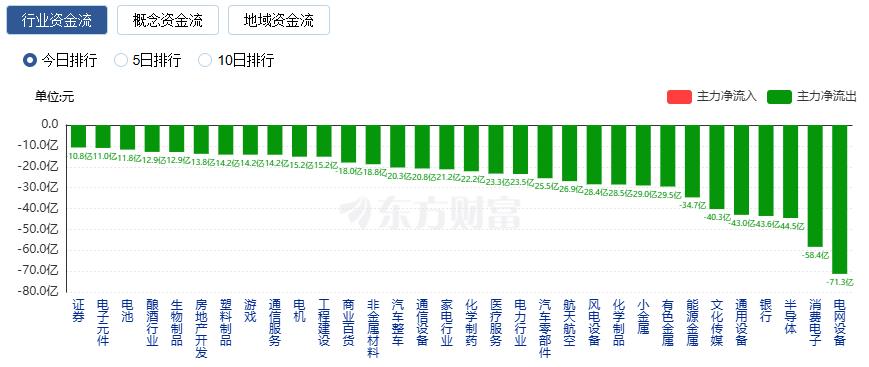 净流出方面,电网设备、消费电子、半导体等净流出排名靠前,其中电网设备净流出71.31亿元。