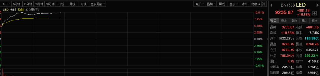 今日早盘,LED板块集体爆发,LED行业指数暴涨超10%。雷曼光电4分钟内20%封死涨停板,聚飞光电、聚灿光电、艾比森、联建光电、瑞丰光电皆20%涨停,恒太照明一度涨超25%。